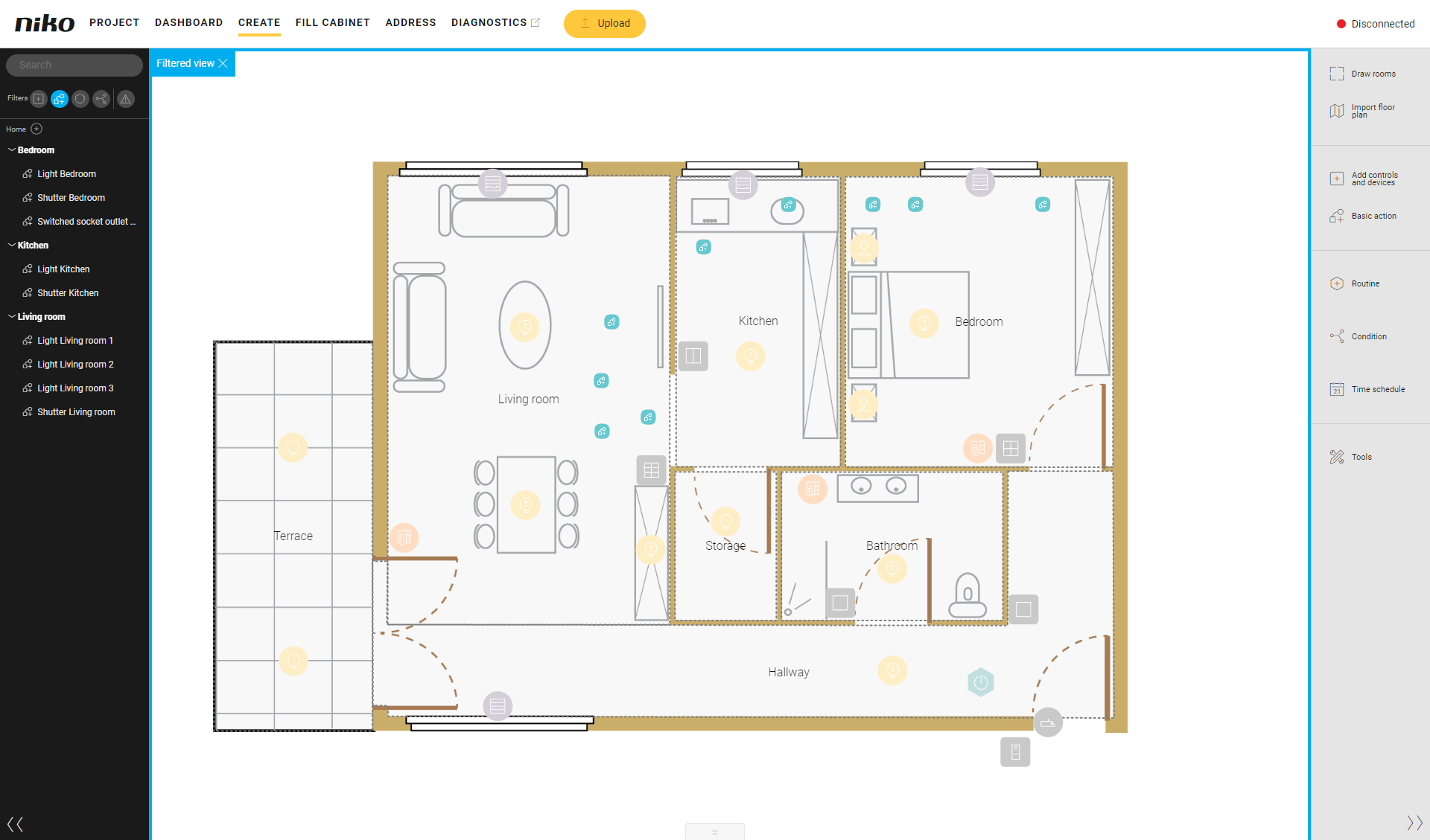 Klik i det venstre sidepanel på de(n) ønskede filterknap(per). Du kan filtrere betjeninger og enheder, basisprogrammering, programmeringer, betingelser, ubrugte betjeninger og enheder eller uadresserede enheder.