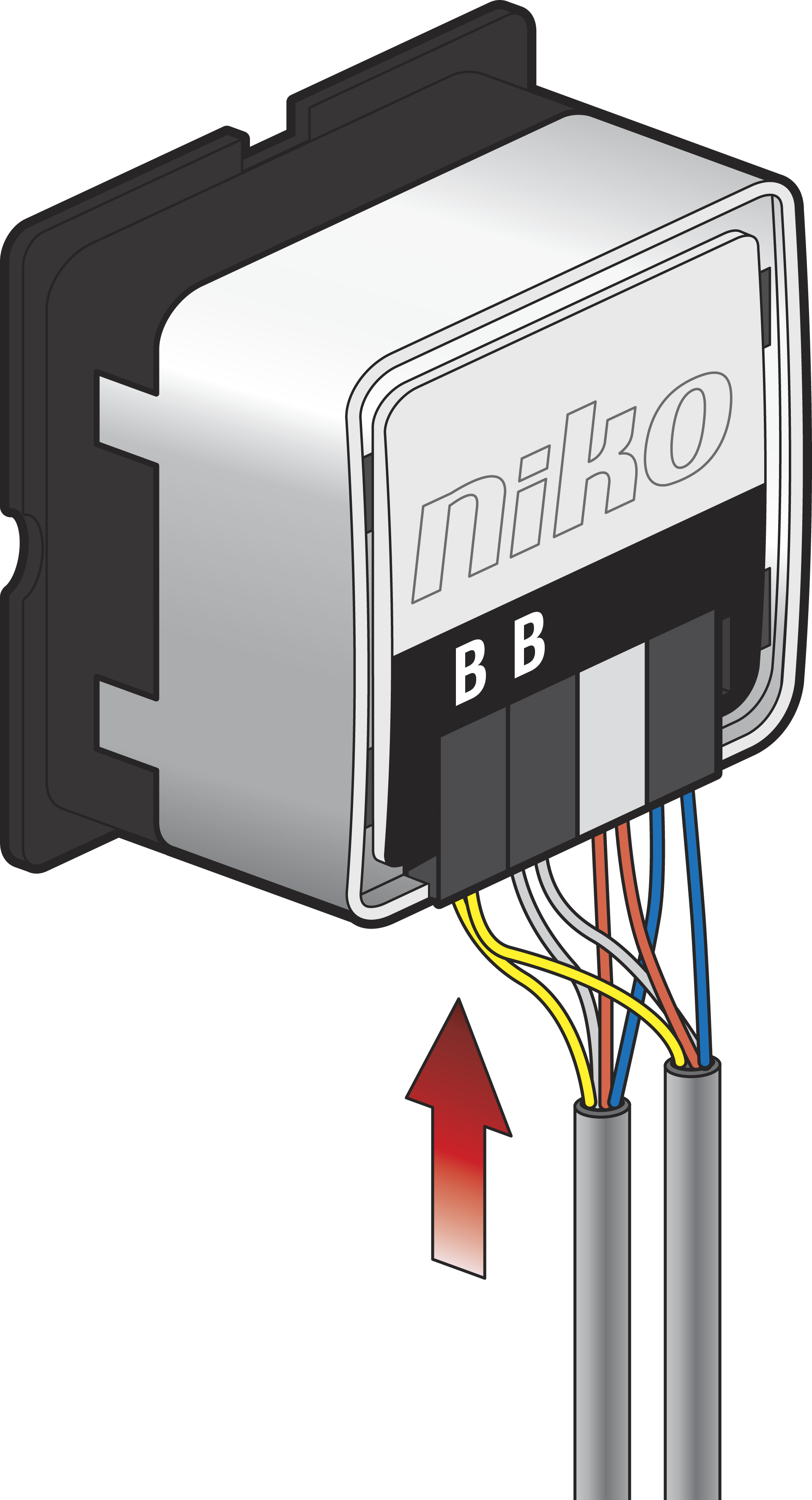 The terminal pair that is marked with “B” acts as the Niko Home Control bus wiring interface (non-polarized, free topology):