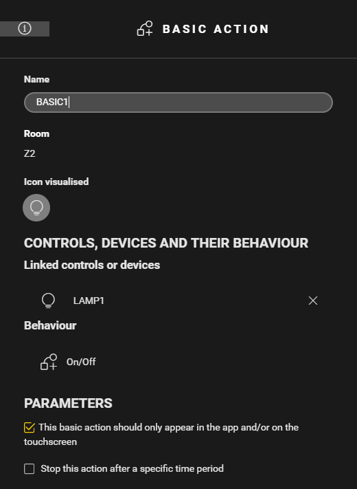 - Create a basic action (BASIC1) to control the outside lighting with the touchscreen. Check the parameter "This basic action should only appear in the app and/or the touchscreen".