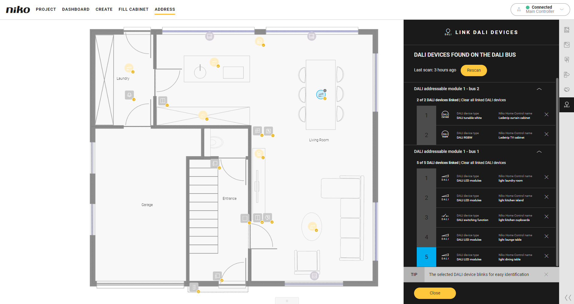 The Link DALI devices pane appears.If the DALI bus has not been scanned before, it is automatically scanned for DALI devices. If it has been scanned before, click the Rescan button to perform a new scan.