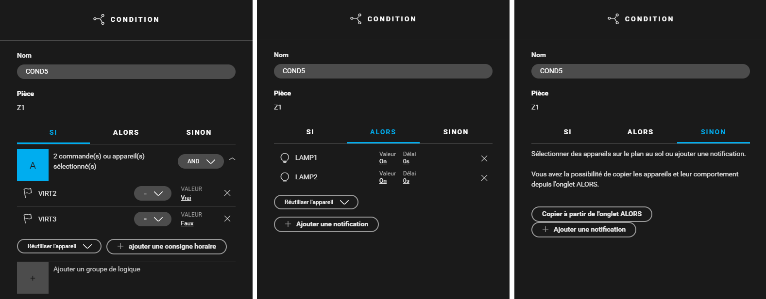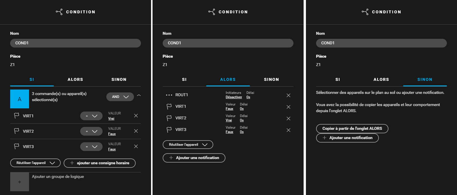 - SI (VIRT1 : Valeur = vrai) et (VIRT2 : Valeur = faux) et (VIRT3 : Valeur = faux)
