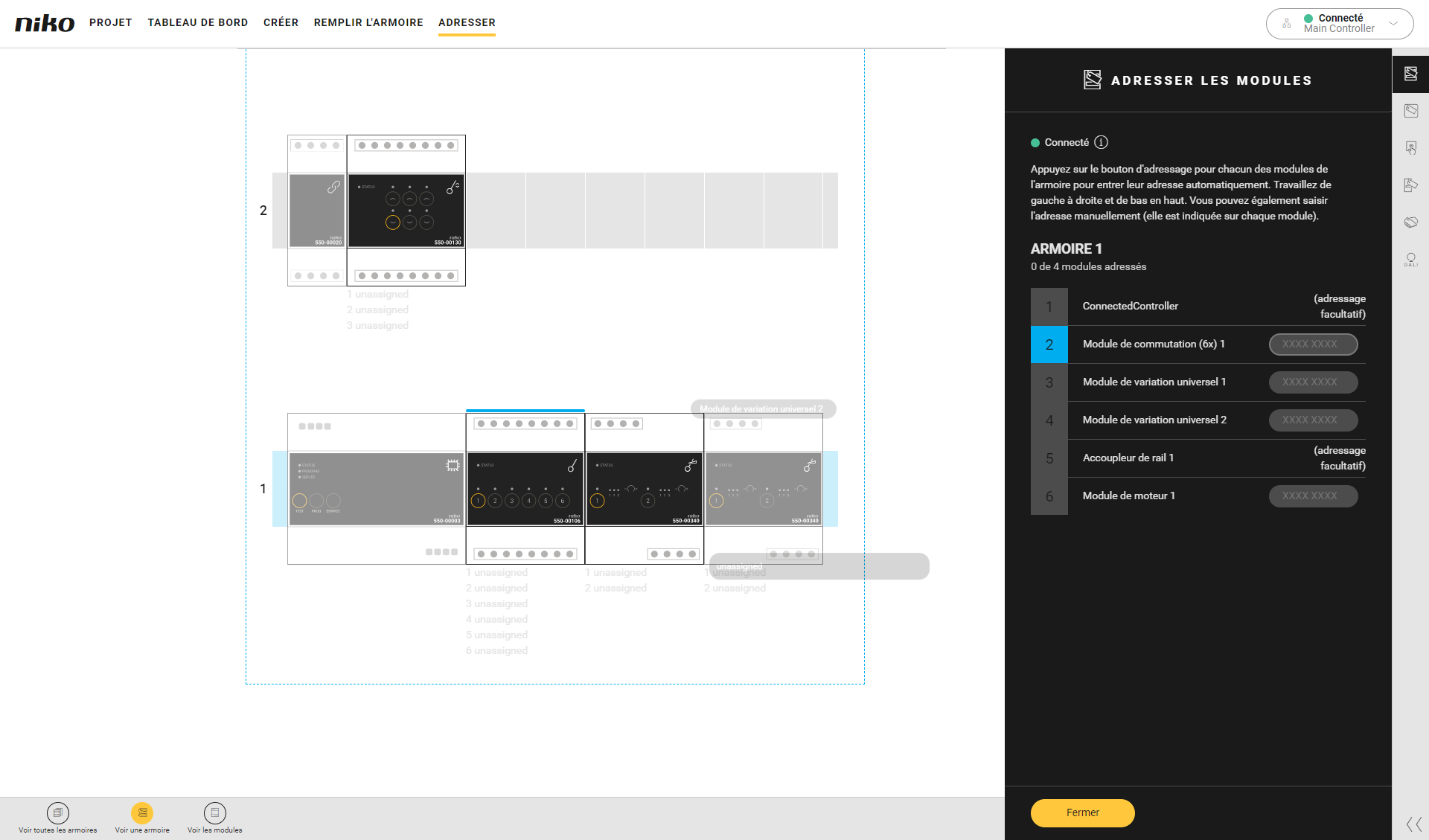 Résultat :Le volet Adressage des modules s'affiche et présente un aperçu de tous les modules dans le(s) coffret(s) électrique(s).