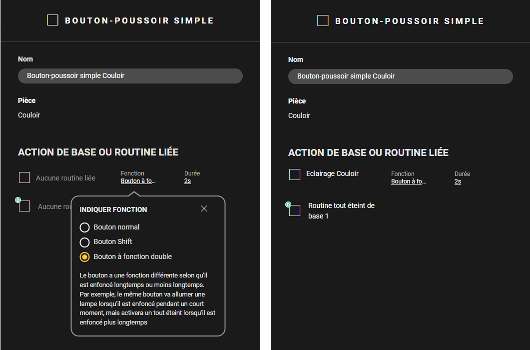 Sélectionnez Bouton double fonction pour attribuer au bouton 2 fonctions, selon qu'on appuie brièvement ou longuement dessus. Réglez la Durée (minimum 1 sec – maximum 5 sec) pour une pression longue et liez la routine ou l'action de base souhaitée aux deux fonctions.