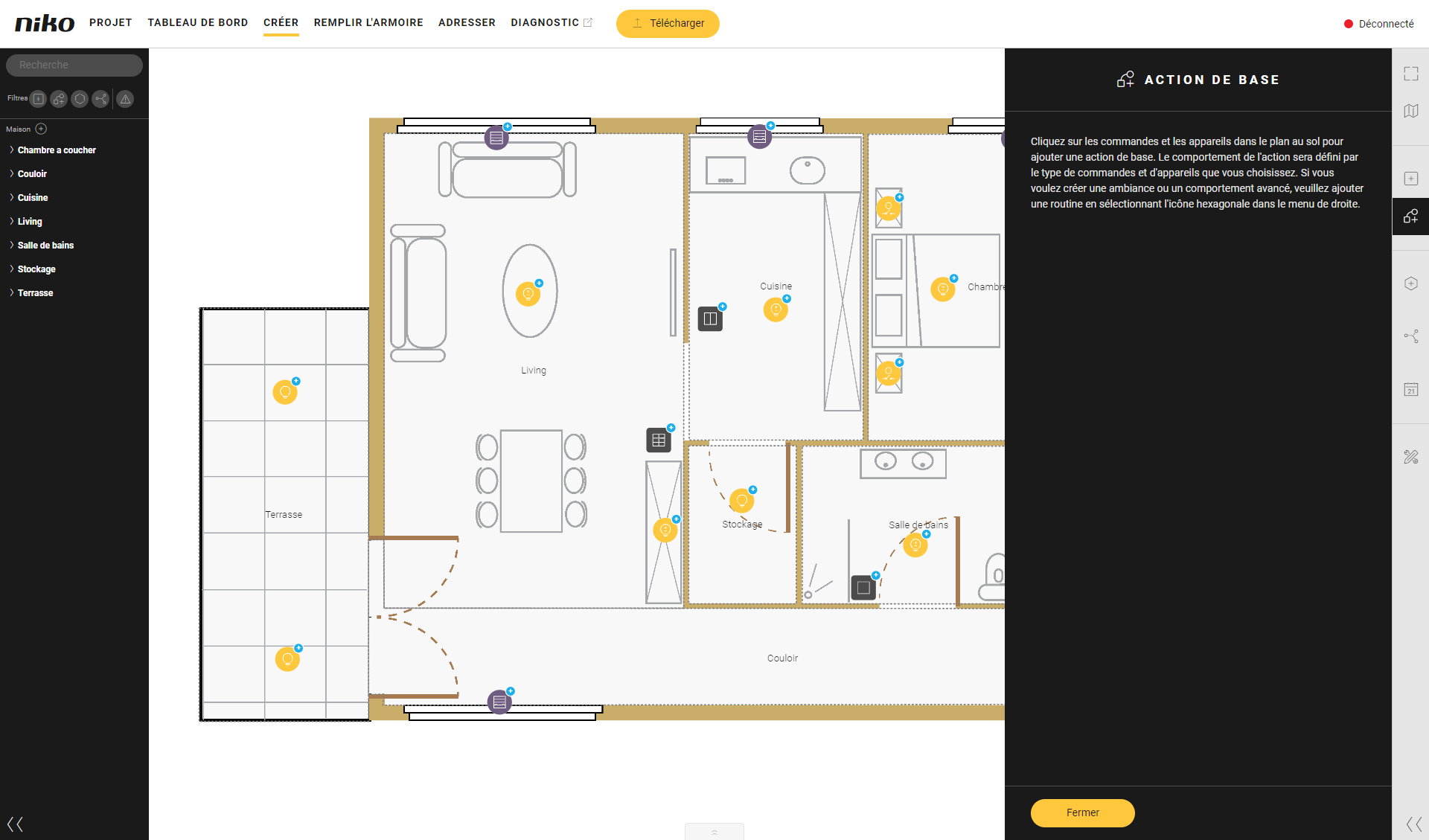 Résultat :Le symbole de l'action de base apparaît dès qu'au moins 1 commande et 1 appareil ont été sélectionnés.