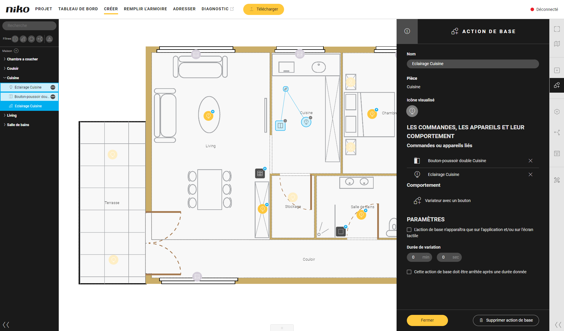 Dans cet exemple, nous créons l'action de base « Éclairage cuisine » avec l'appareil « Éclairage cuisine » et la commande « Bouton-poussoir double cuisine ».