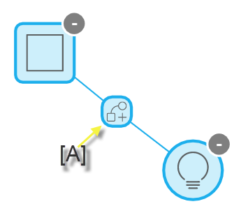 Tous les appareils et commandes sélectionnés sont liés à l'action de base par une ligne. La bulle au centre de la ligne [A] est le symbole de l'action de base. Vous pourrez cliquer dessus ultérieurement pour éditer certaines caractéristiques de cette action de base si nécessaire.