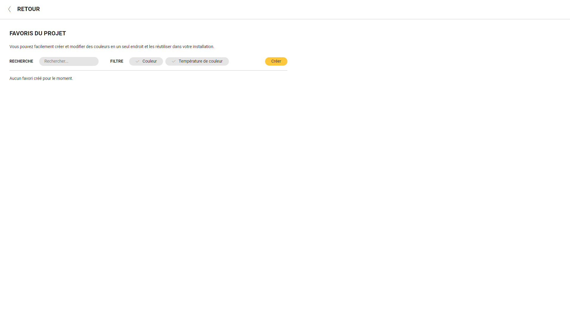Vous pouvez à présent utiliser cette couleur favorite pour configurer les appareils DALI blanc réglable, DALI RVB et DALI RVBB dans des routines et des conditions.Cliquez sur Retour pour revenir dans le menu Tableau de bord.