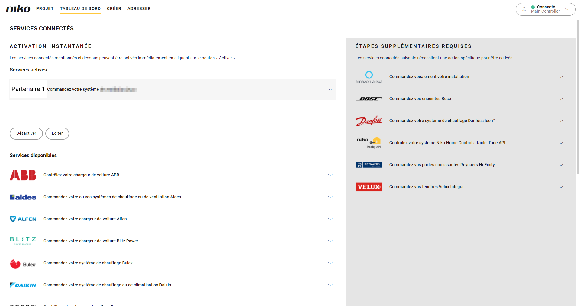 Dans la rubrique Services activés, cliquez sur la flèche à côté du service connecté que vous souhaitez dissocier de votre installation.