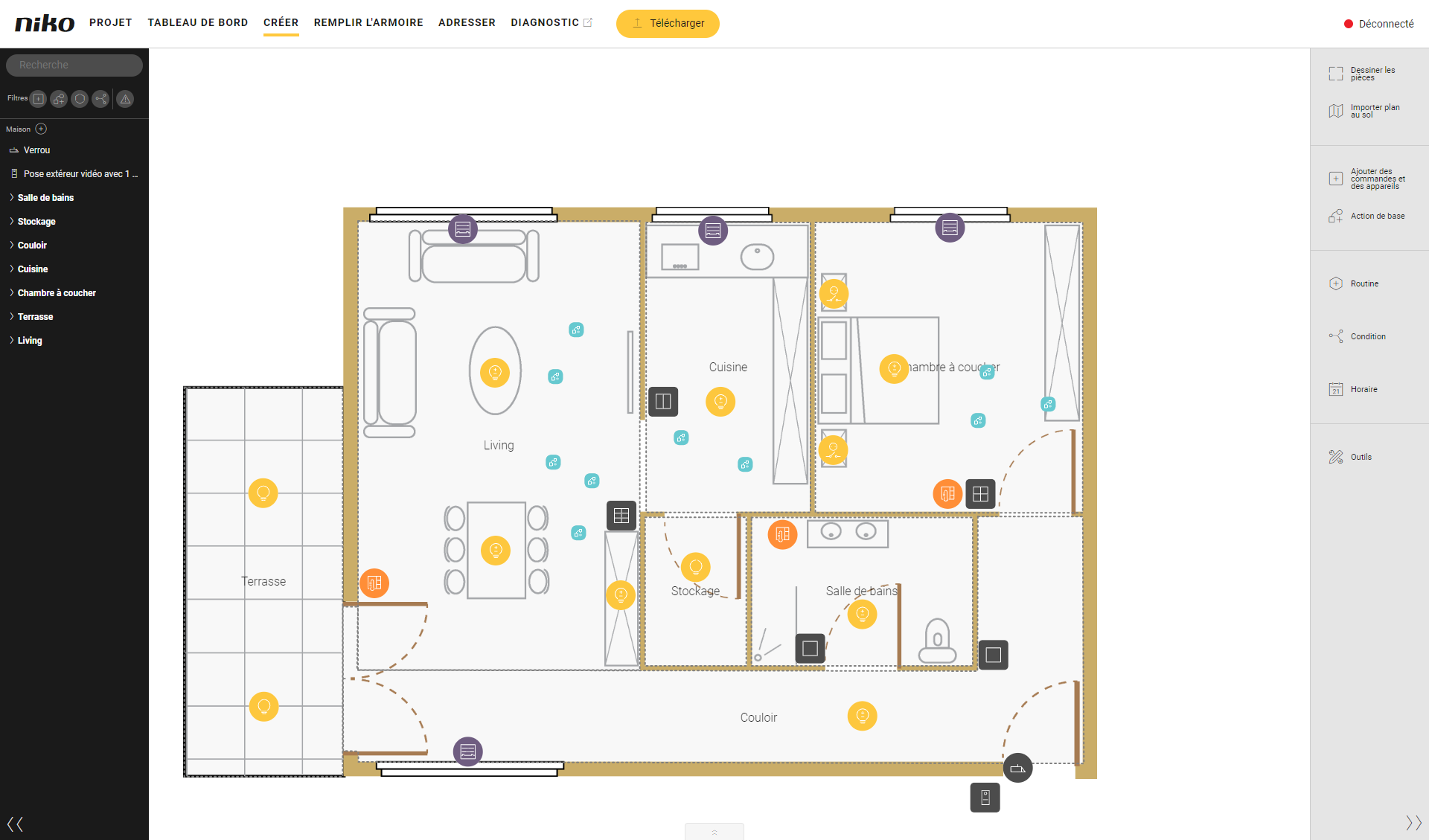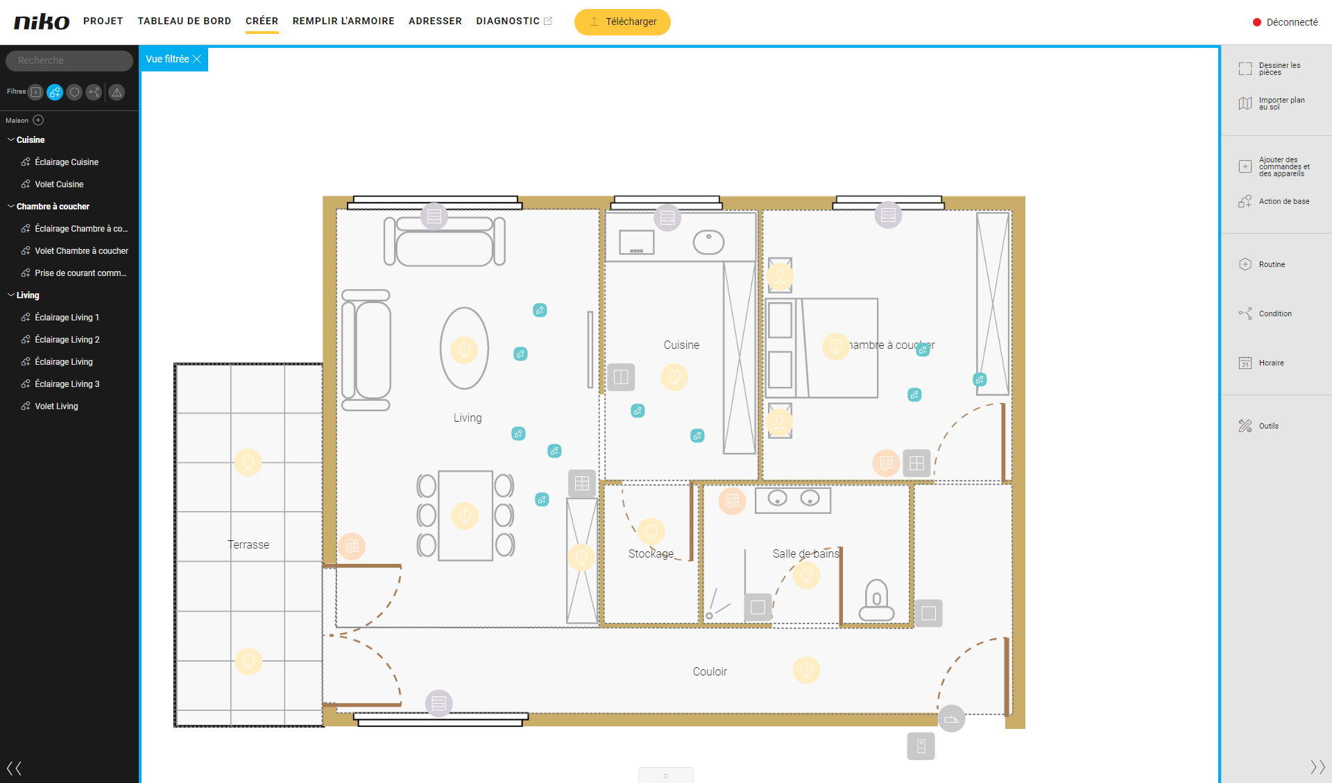 Dans la barre latérale gauche, cliquez sur le(s) bouton(s) de filtre souhaité(s). Vous pouvez filtrer des commandes et des appareils, des actions de base, des routines, des conditions, des commandes et des appareils non utilisés, ou des appareils non adressés.