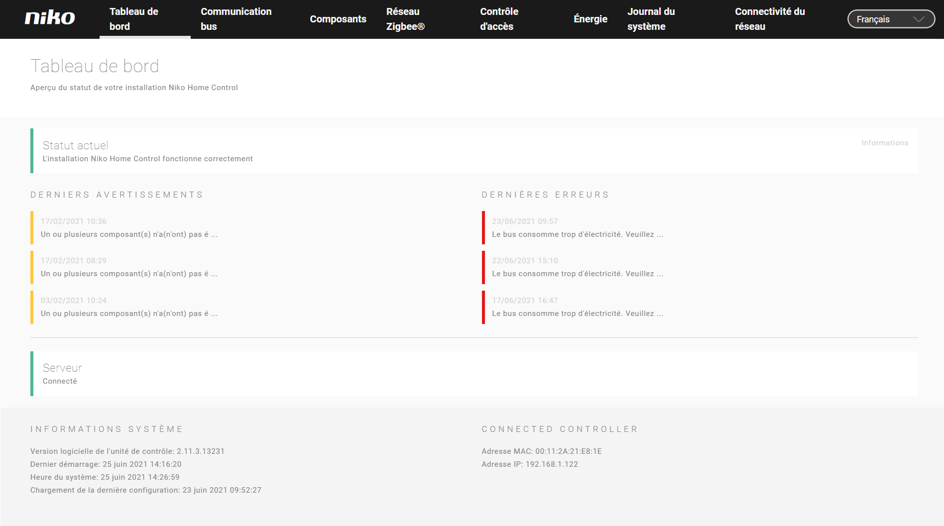 Tableau de bord : pour voir le statut actuel, les avertissements et les erreurs