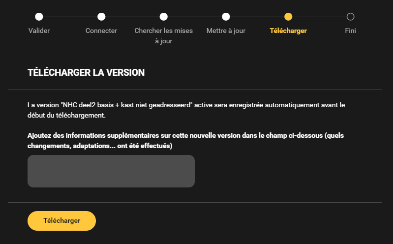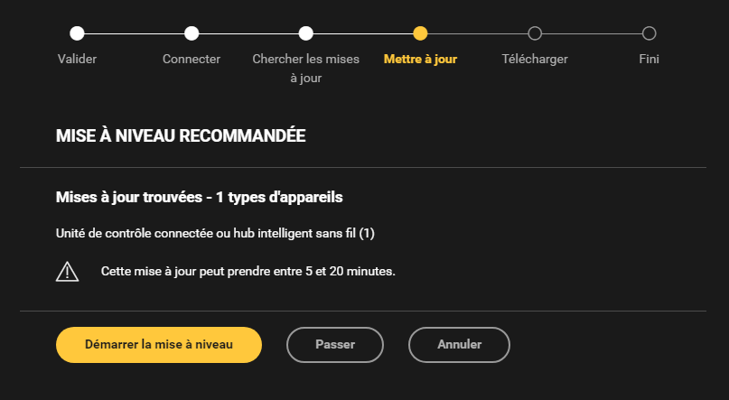 3 | Chercher les mises à jour | Vérifiez le micrologiciel de l'installation Niko Home Control connectée pour les mises à niveau. | Le micrologiciel le plus récent est disponible. | Vous passez automatiquement à l'étape 4. |