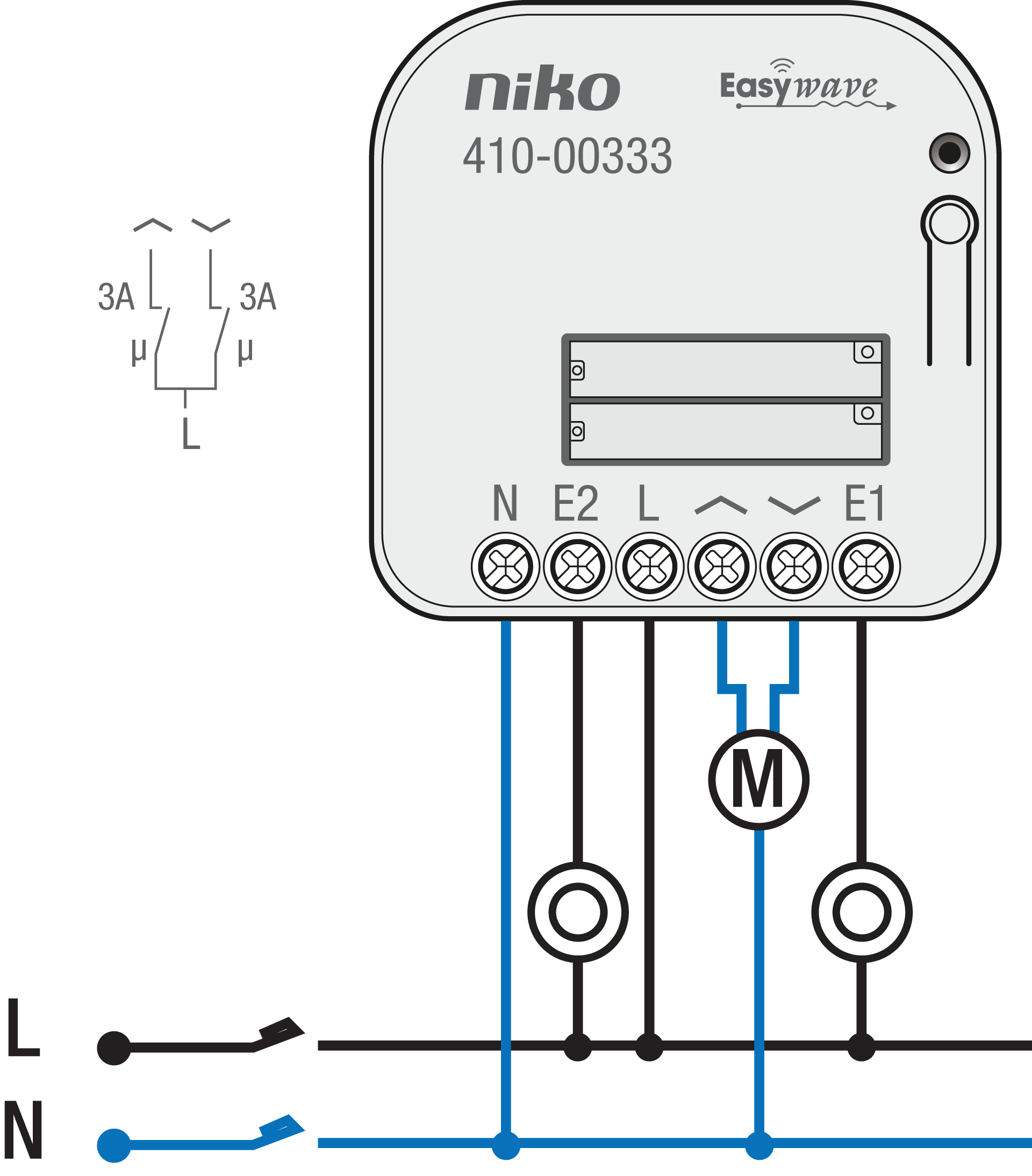 Dit product kan draadloos bediend worden via een Niko Easywave handzender (05-31X) en/of een draadloze drukknop (410-0000X). Voor lokale bediening kun je externe knoppen aansluiten.