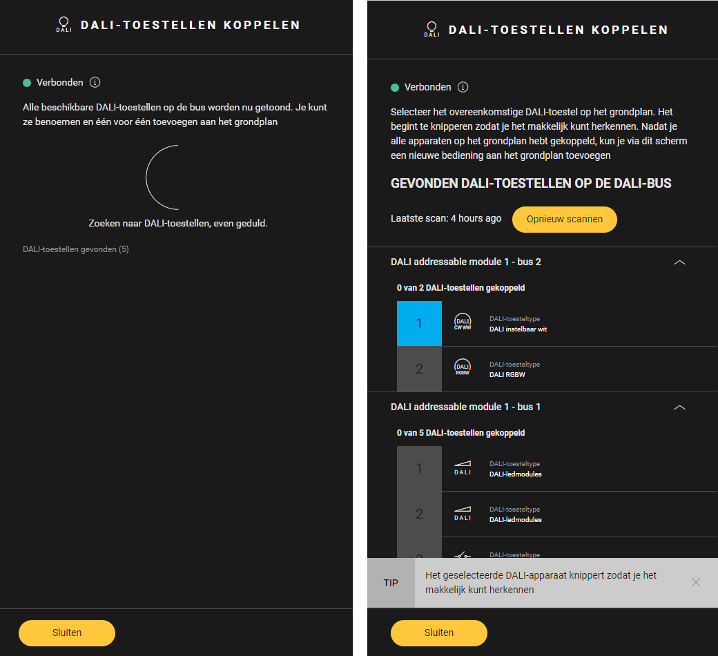 Het deelvenster DALI-toestellen koppelen verschijntAls de DALI-bus nog niet eerder is gescand, wordt deze automatisch gescand op DALI-apparaten. Als de DALI-bus al eerder is gescand, klik je op de knop Opnieuw scannen m een nieuwe scan uit te voeren.