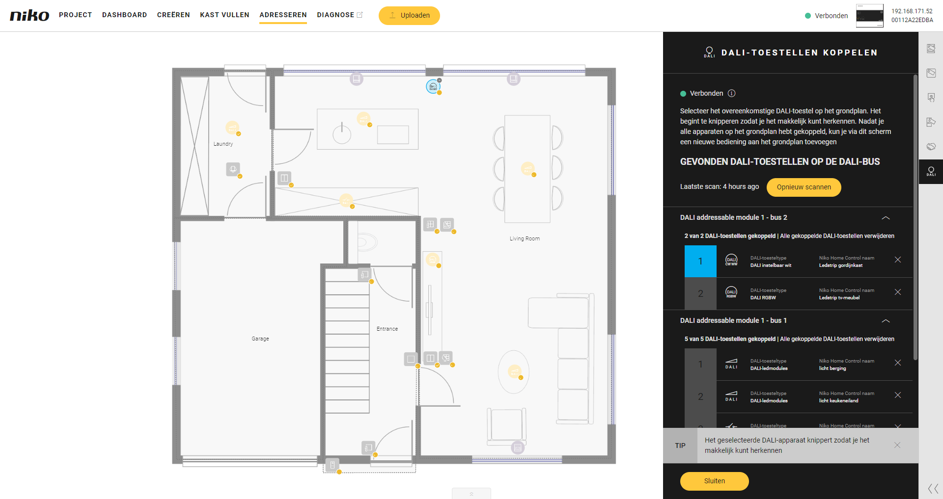De gevonden DALI-toestellen worden getoond. Ze worden gesorteerd per DALI-module en per -bus.