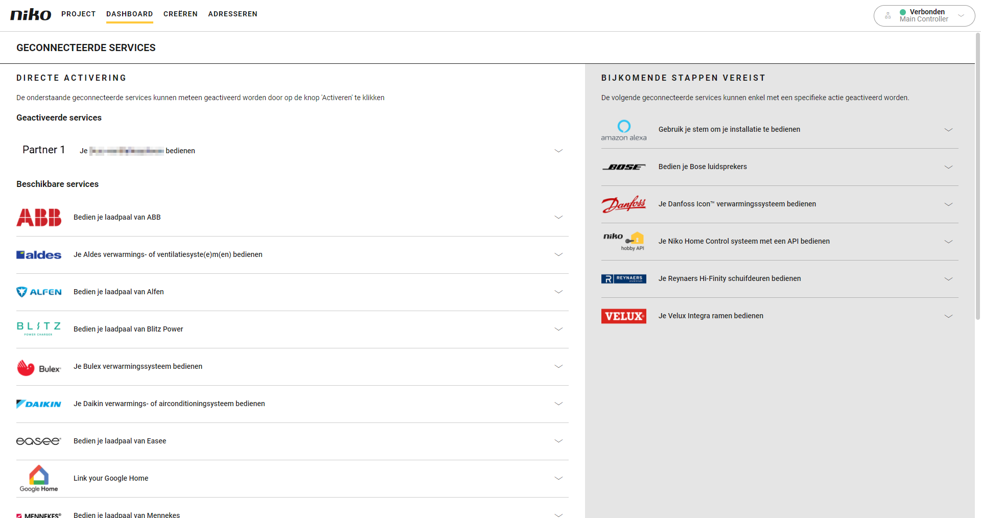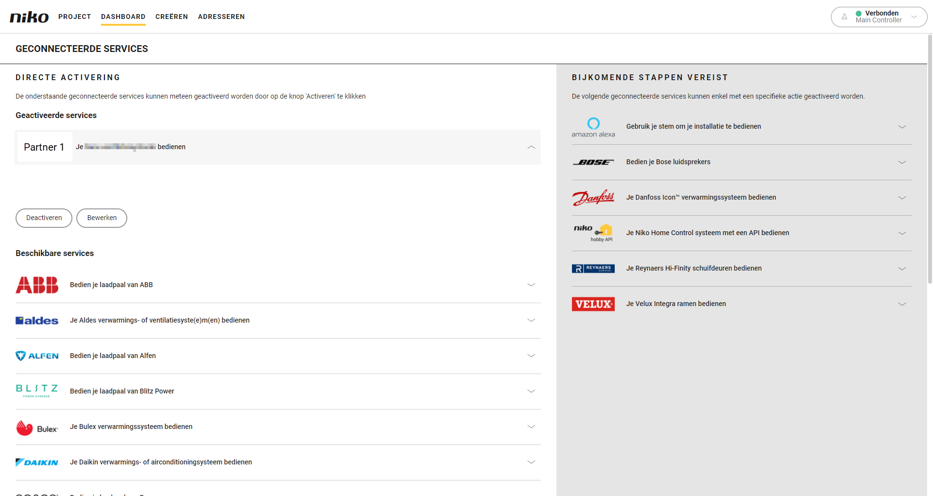 Klik op Geconnecteerde services beheren. Hier kun je alle services gekoppeld aan je installatie beheren, ook die van partnermerken.