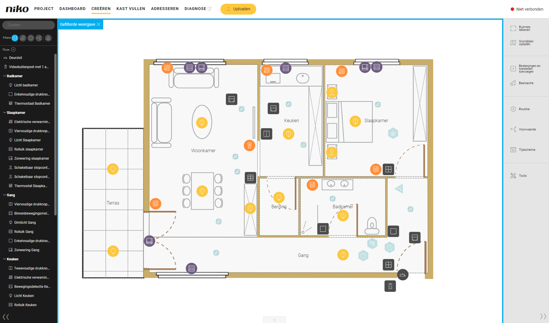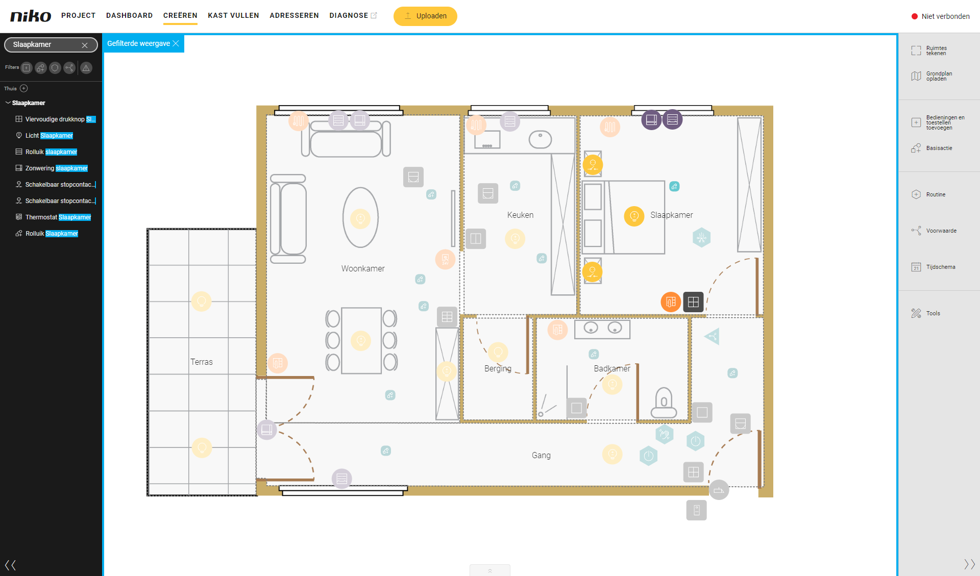 Je kunt de filterfunctie in de linkerzijbalk gebruiken om bedieningen, toestellen, basisacties, routines of voorwaarden te kiezen, bijvoorbeeld om alleen geschakelde lichtkringen of alleen basisacties te laten zien.